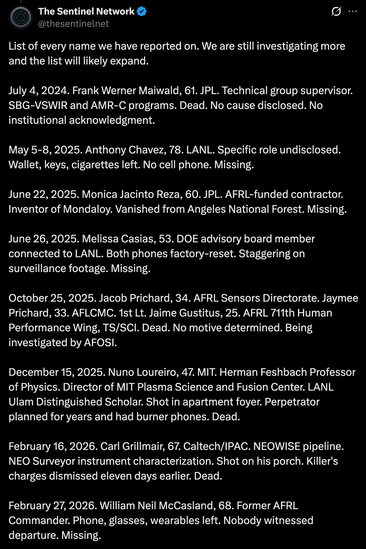 Research group TheSentinel has been reporting on some of these missing and murdered researchers, as well as the 3I/ATLAS comet over the last few months (which we will get to in a moment).