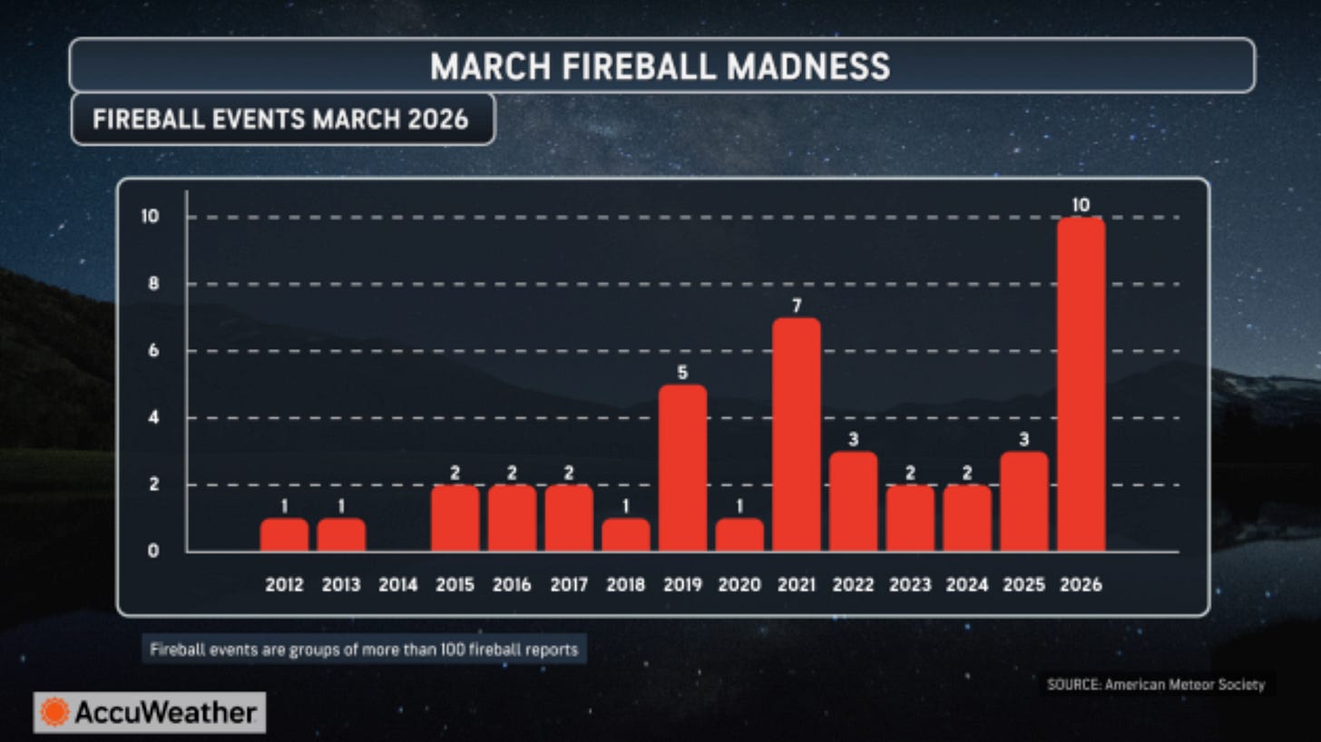 AccuWeather has tracked the uptick and notes that there has already been 10 “fireball events” already this year, a fireball event being classified as any fireball with 100 or more reports about it.