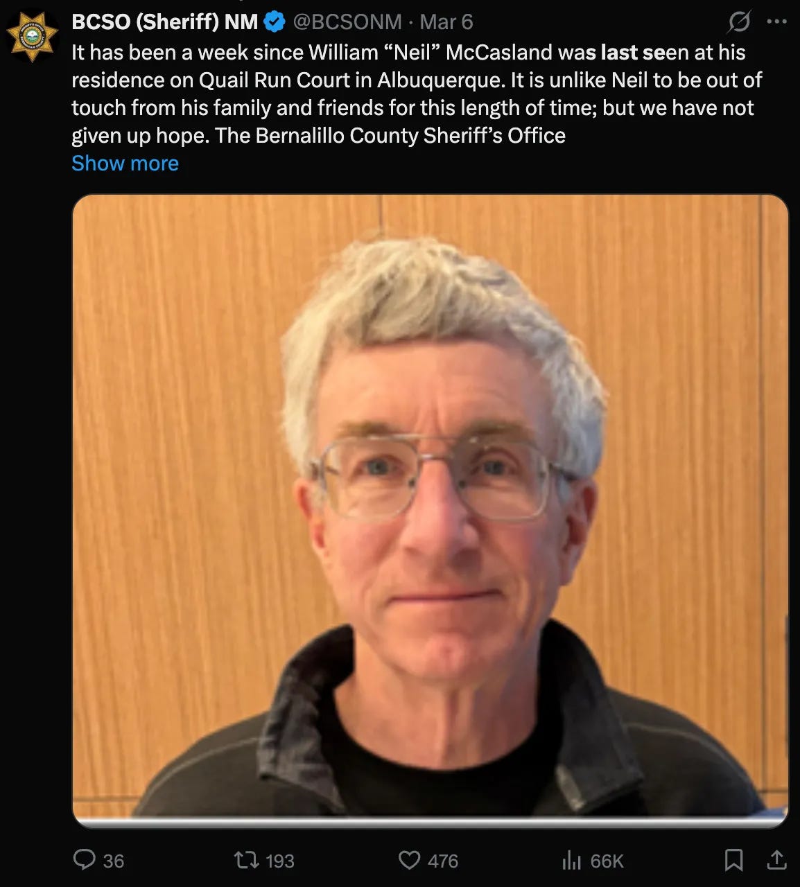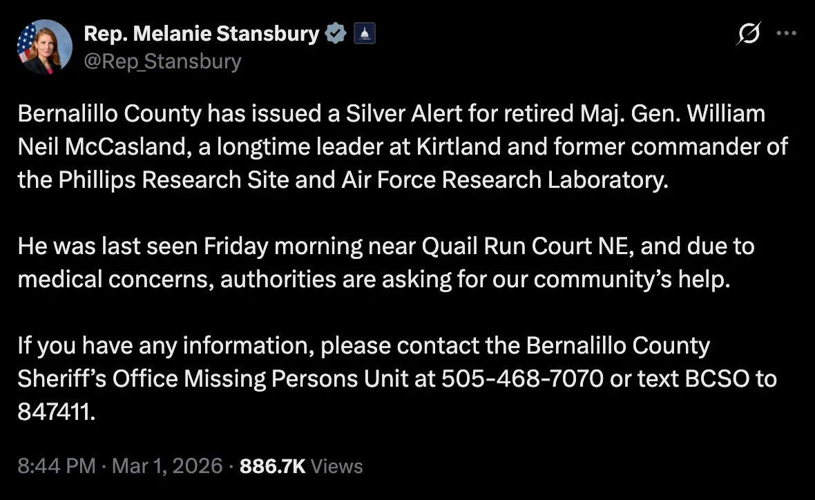 On February 27th, a missing person alert for retired Major General William Neil McCasland was sent out by Bernalillo’s County Sheriffs Office, the New Mexico county that Albuquerque is in.