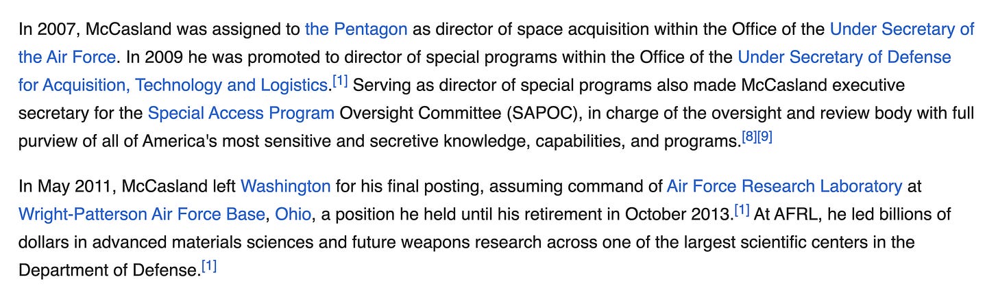 General McCasland was in the news back in 2016 for his name appearing in John Podesta's emails published by WikiLeaks. I remember reading and reporting on this vividly, for the UFO/zero-point energy topics discussed in Podesta’s email were just as mind blowing to me as the “pizza” codes.