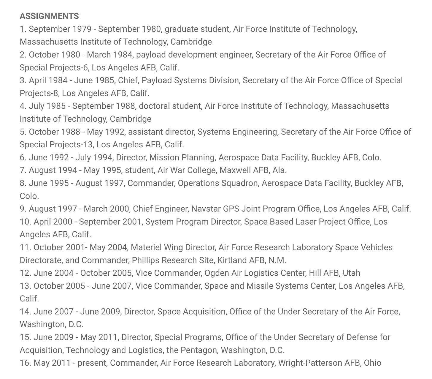 His two most notable appointments include Director of Special Programs within the Office of the Under Secretary of Defense for Acquisition, Technology and Logistics from 2009 to 2011, as well as his his commanding position of the Air Force Research Laboratory (AFRL) at Wright-Patterson Air Force Base in Ohio from 2011 to 2013.